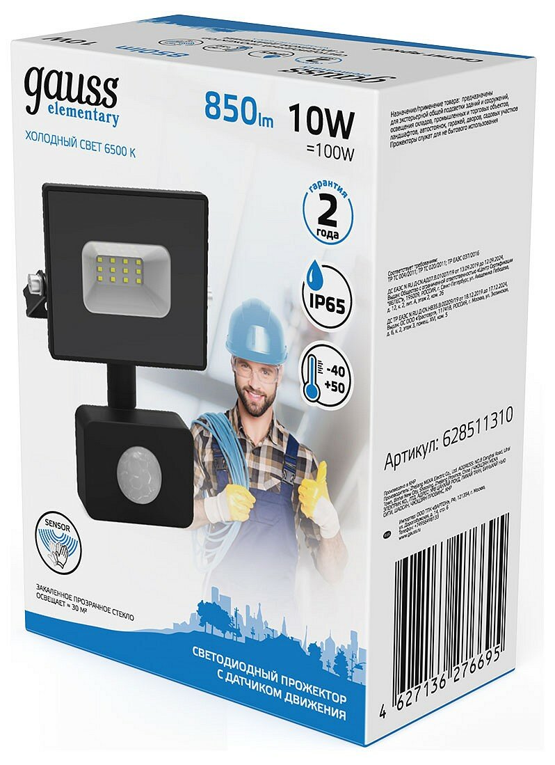 Прожектор светодиодный с датчиком движения gauss Elementary-S 628511310, 10 Вт, свет: холодный белый