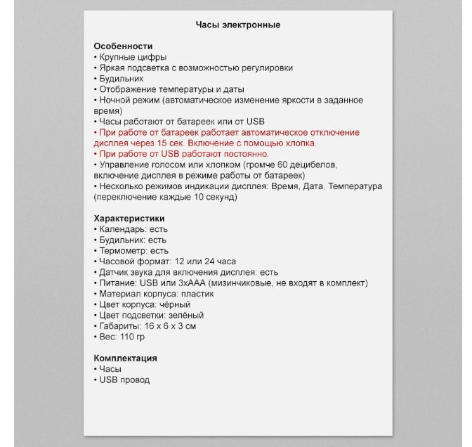| Дополнительная информация | При работе от USB работают постоянно. При работе от батареек работает автоматическое отключение дисплея через 15 сек. Включение с помощью хлопка. |