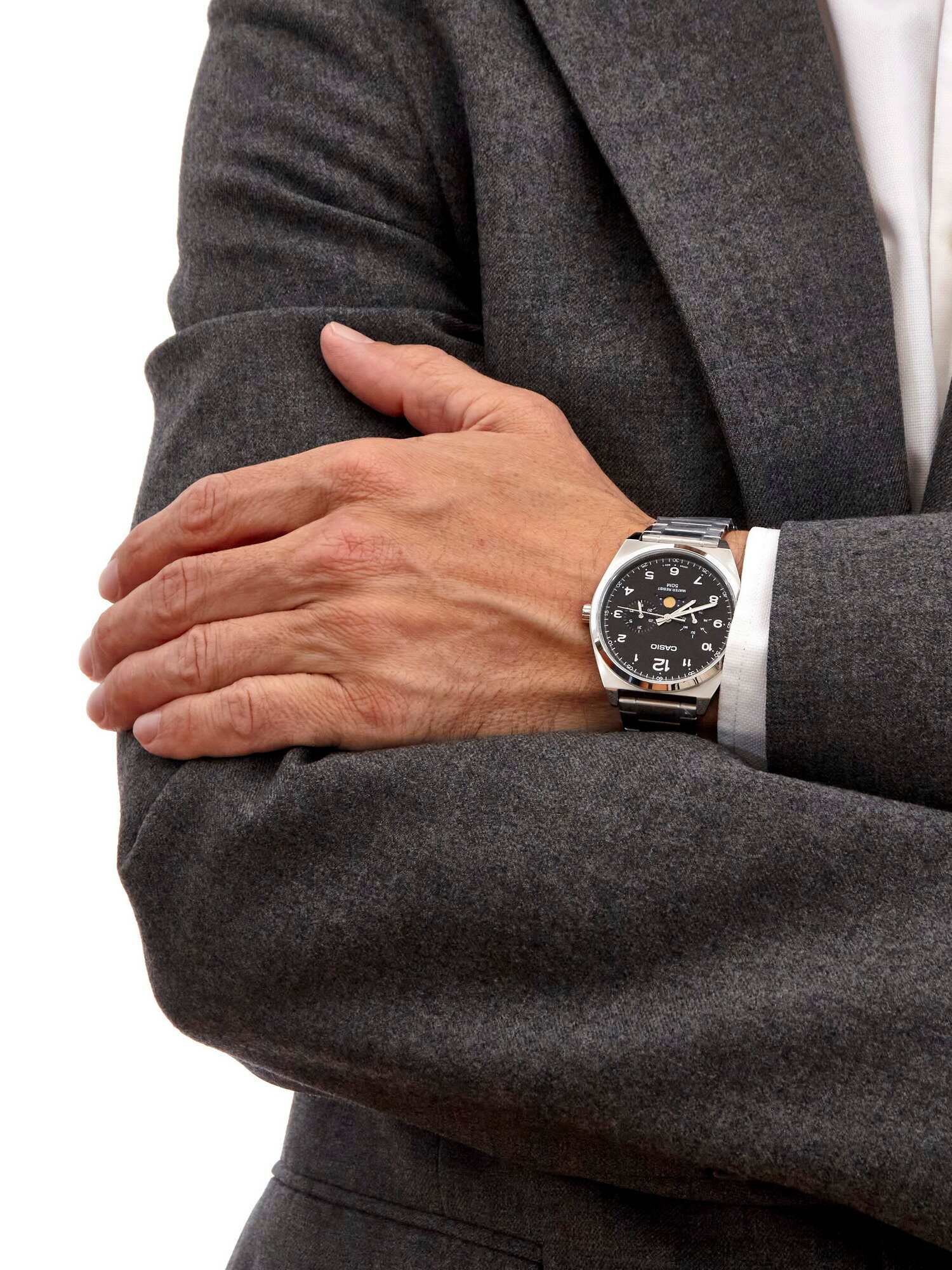 MTP-M300D-7A Casio наручные часы кварцевые WR50 (5 атм) мужские хром лунный календарь отображение дня недели, отображение числа подсветка стрелок минеральное стекло