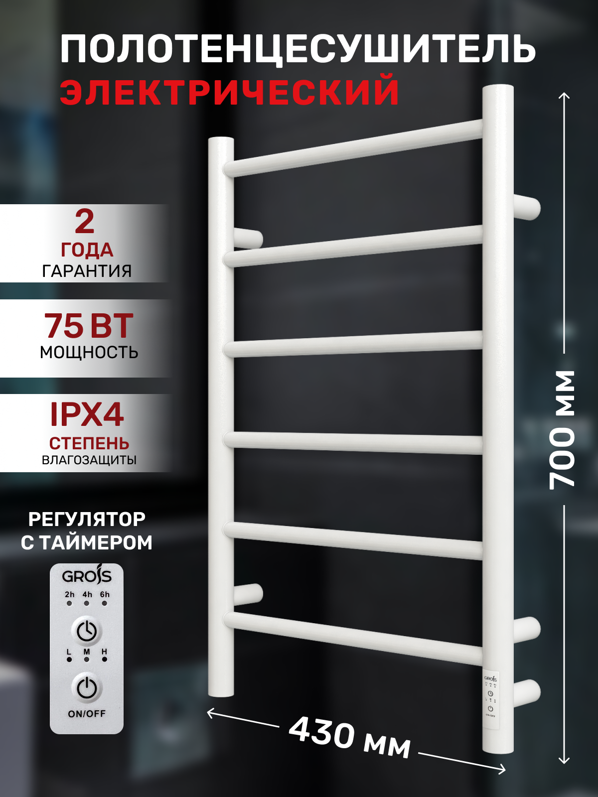 Полотенцесушитель электрический Grois Alex GR-101 400мм 600мм П6 белый матовый подключение универсальное форма Лесенка