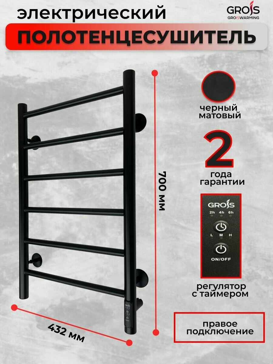 Полотенцесушитель электрический Grois Alex GR-101 500мм 600мм П6 черный матовый подключение универсальное форма Лесенка