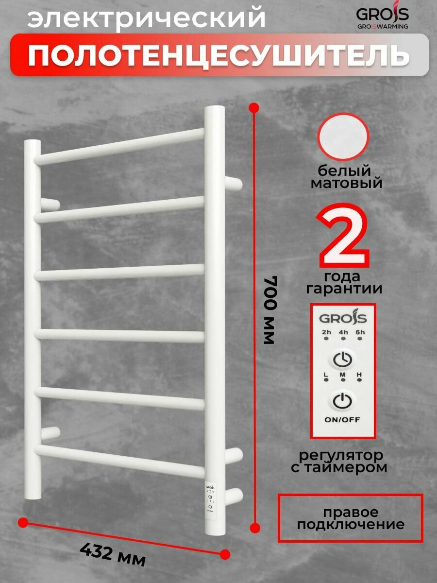 Полотенцесушитель электрический Grois Alex GR-101 400мм 600мм П6 белый матовый подключение универсальное форма Лесенка