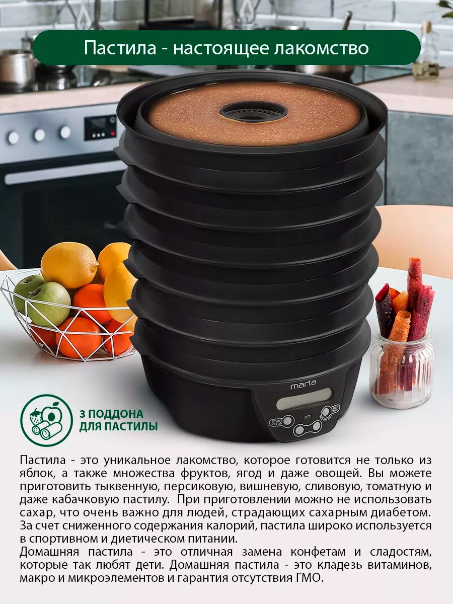 Дегидратор сушилка для овощей электросушилка MARTA MT-FD1888E 18 поддонов (12 основных + 3 для пастилы + 3 для ягод) черный