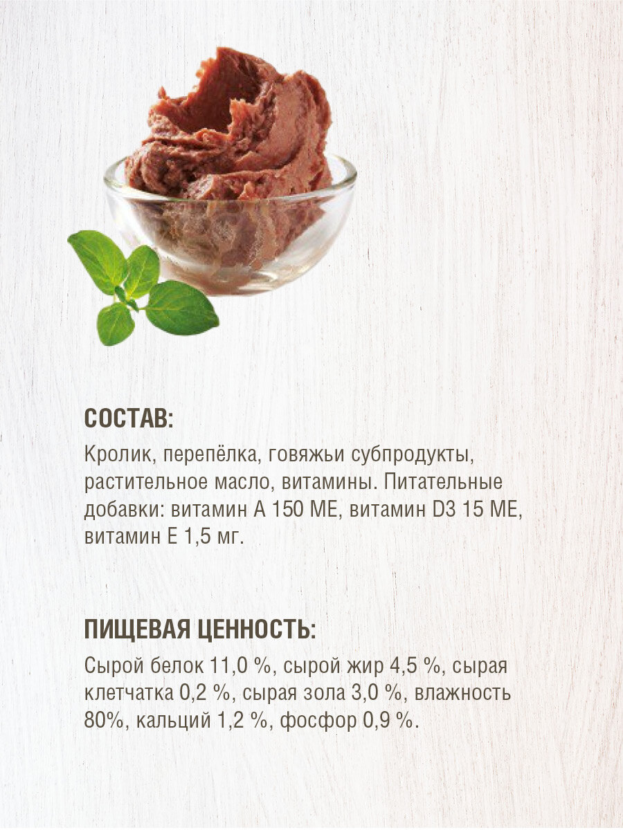 | Состав | курица, индейка, говяжьи субпродукты, растительное масло, витамины |