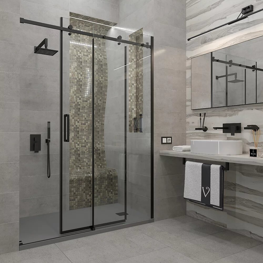 Душевая дверь Veconi 130х195 VN74B раздвижная, стекло прозрачное, профиль черный