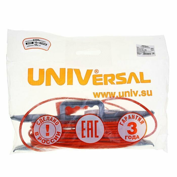 Удлинитель UNIVersal 1 гнездо 10 м длина с заземлением кабель ПВС 3х 0,75 УШ-10 мощность 2200 Вт IP54 Универсал 220в, арт. 9632021