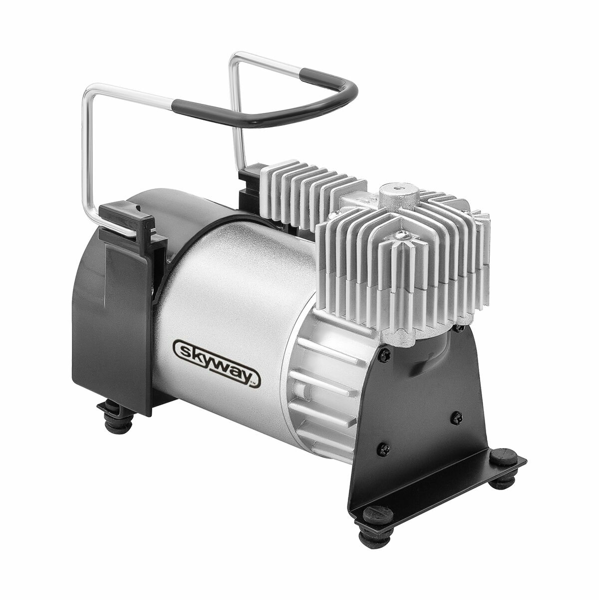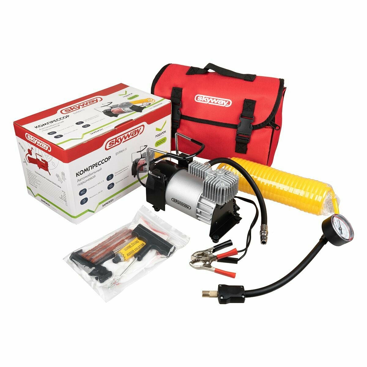 Компрессор автомобильный SKYWAY Буран-11 металлический поршневой, компактный, от аккумулятора, со шлангом и манометром. Сумка для переноски и дополнительными насадками, S02001024