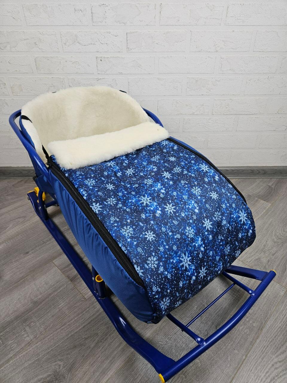 Матрасик для санок меховой 3 в 1 Снежинки на синем бок голубой мех белый
