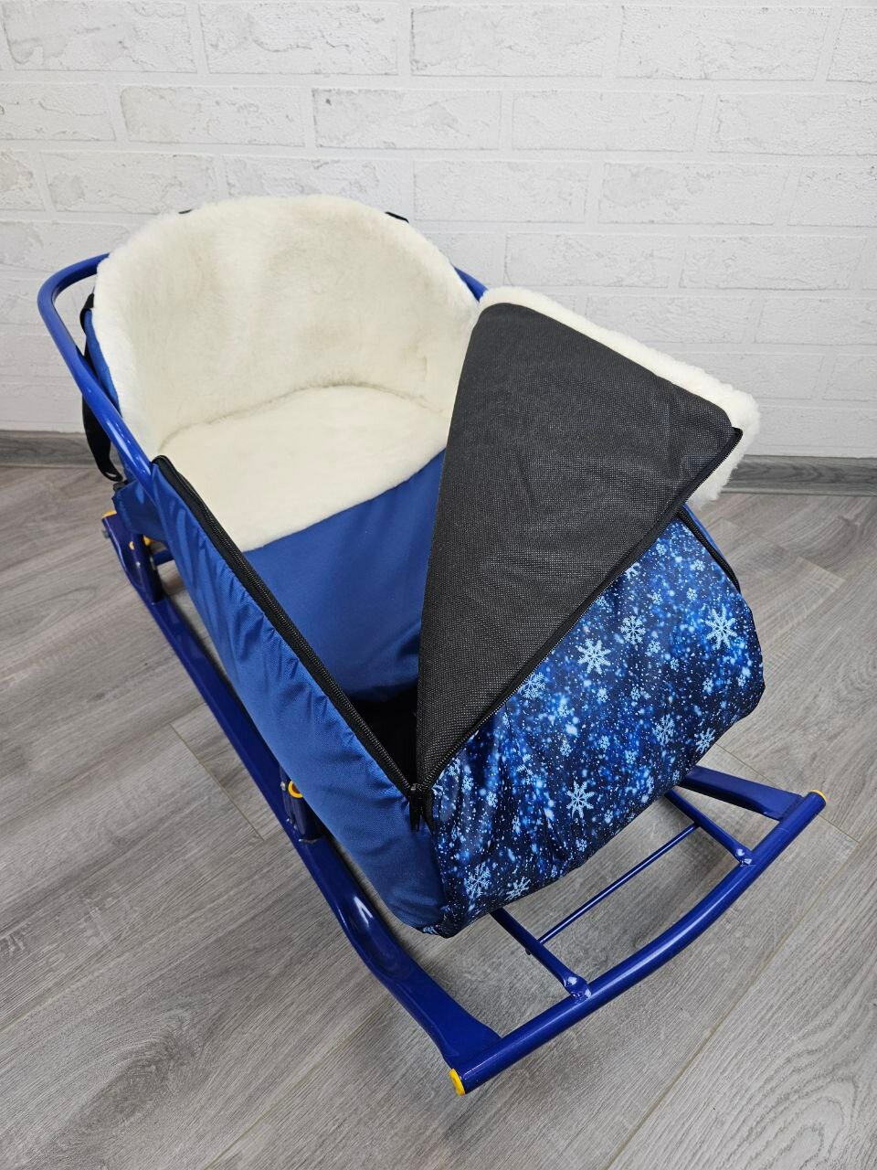 Матрасик для санок меховой 3 в 1 Снежинки на синем бок черный мех черный