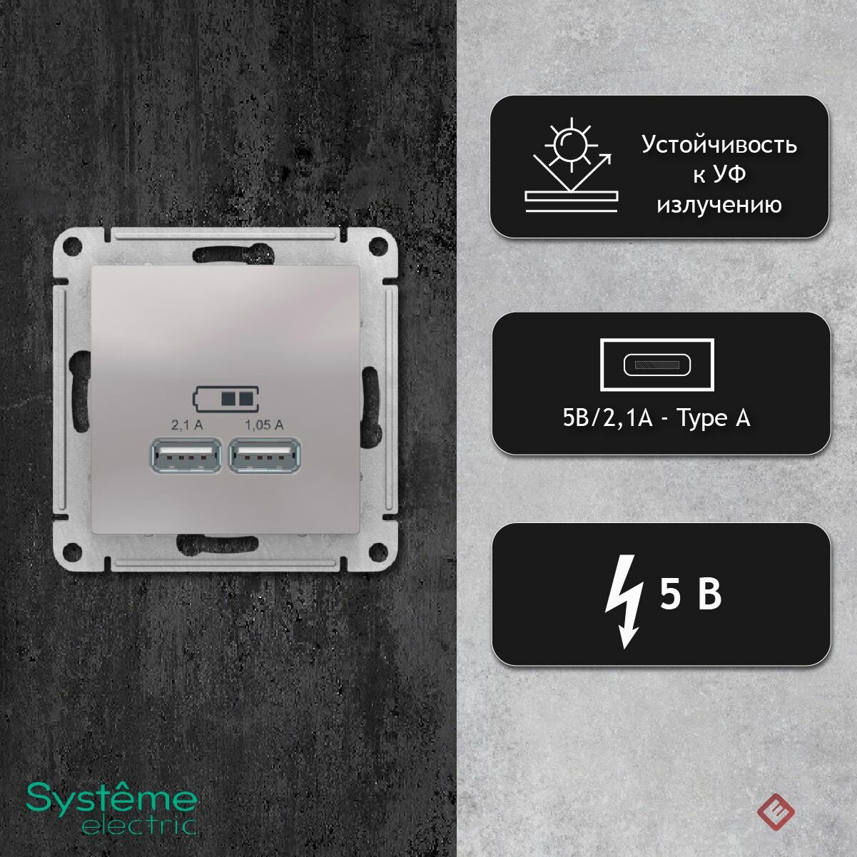 СохранитьРозетка USB A+A (5В/2,1А 2х5В/1,05А) Алюминий, Systeme Electric AtlasDesign интересное: