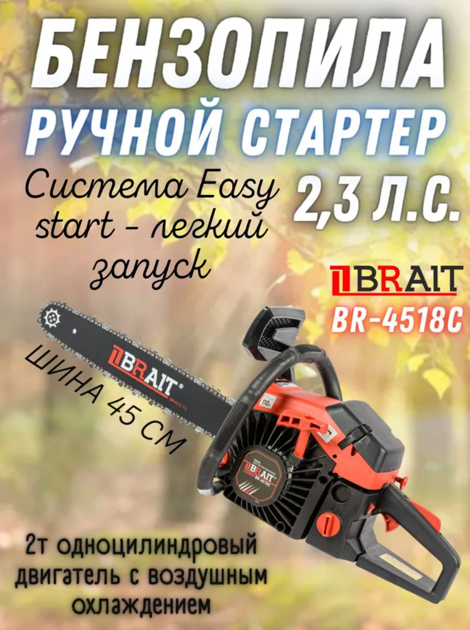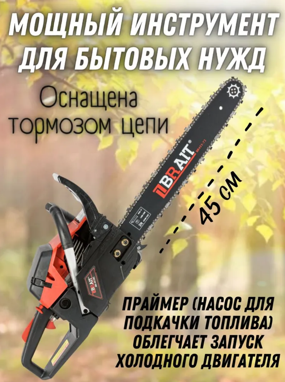 Бензопила BRAIT 4518С (мощность 2.5 л. с. легкий пуск)