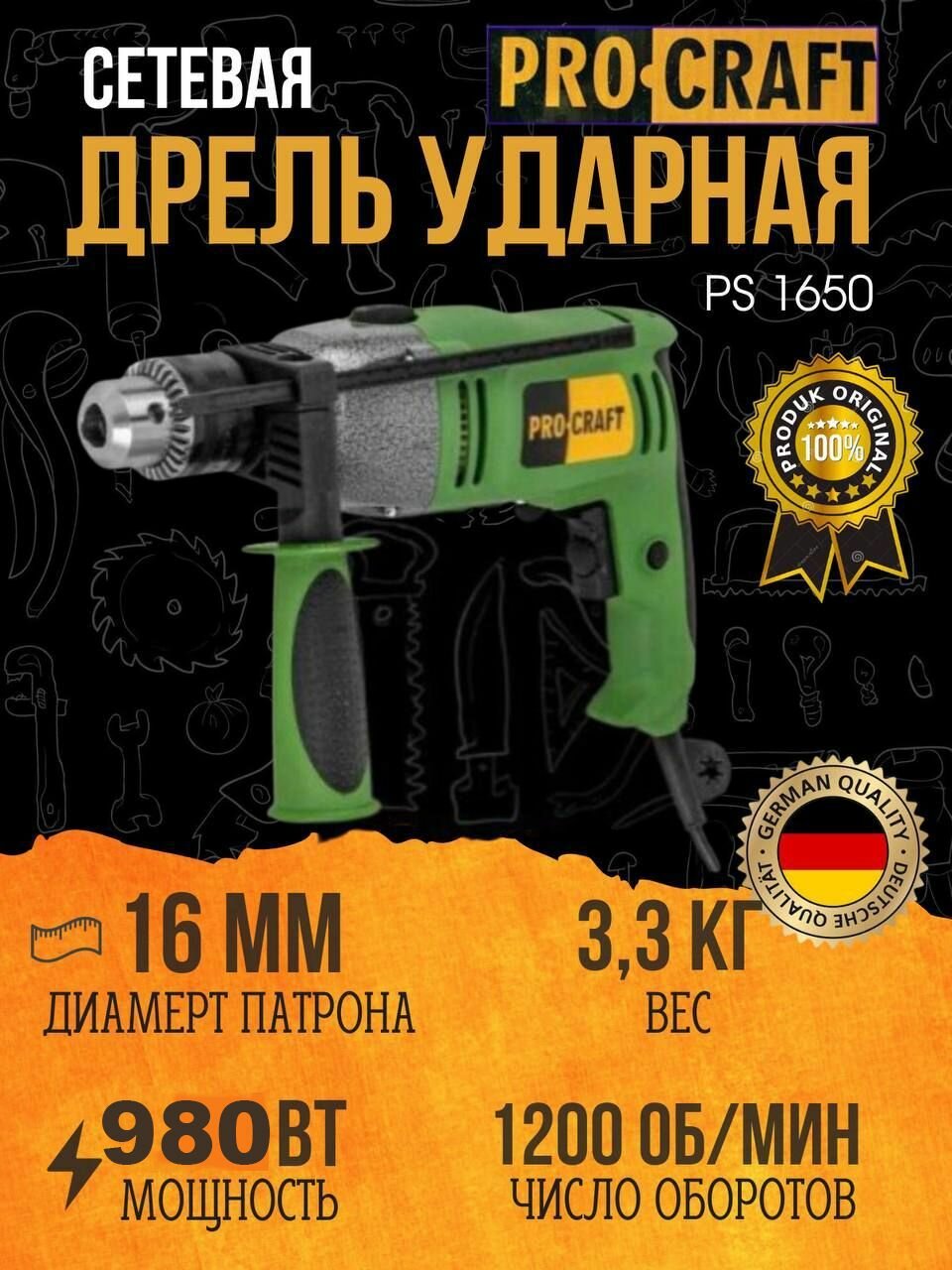 Купить Дрель ударная Pro-Сraft Professional PS-1650. 16мм. патрон. 2е скорости.