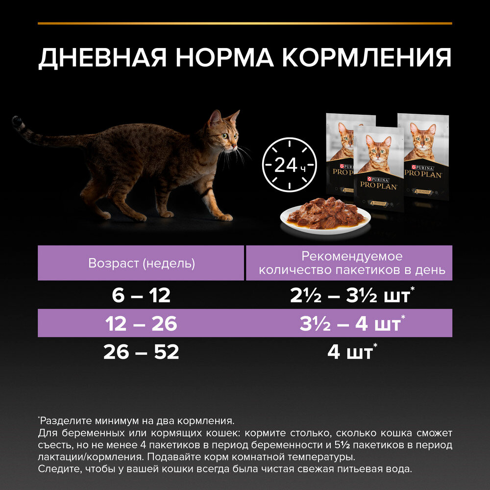 | Дозировка | Для взрослой кошки среднего веса (4 кг) требуется 3 пакетика в день, разделенных минимум на два кормления. Индивидуальные потребности кошки могут варьироваться, и ежедневное количество корма должно быть скорректировано в соответствии с необходимостью поддержания оптимального веса кошки. Подавайте корм комнатной температуры. Следите, чтобы у вашей кошки всегда была чистая свежая питьевая вода |