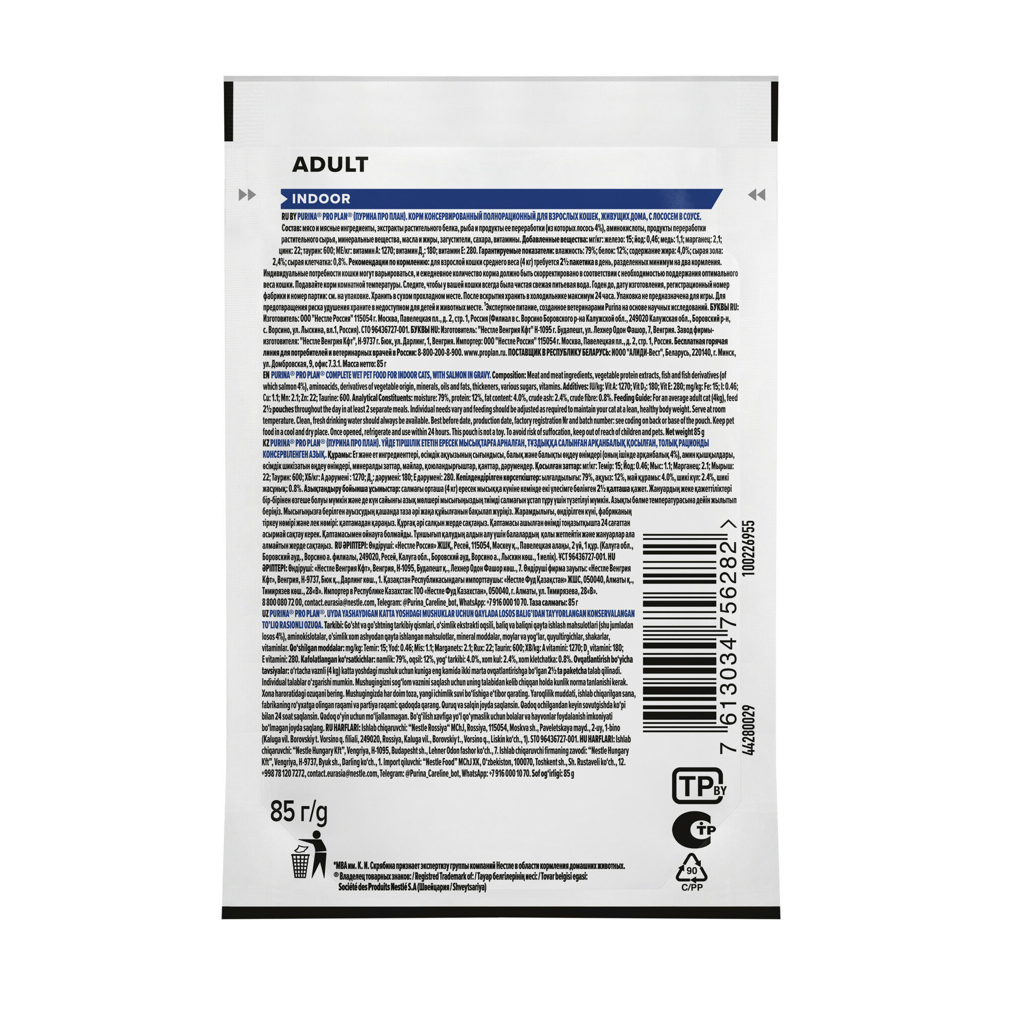 Pro Plan Влажный корм для взрослых кошек, живущих дома, с лососем в соусе, пауч 85 г, 6 штук