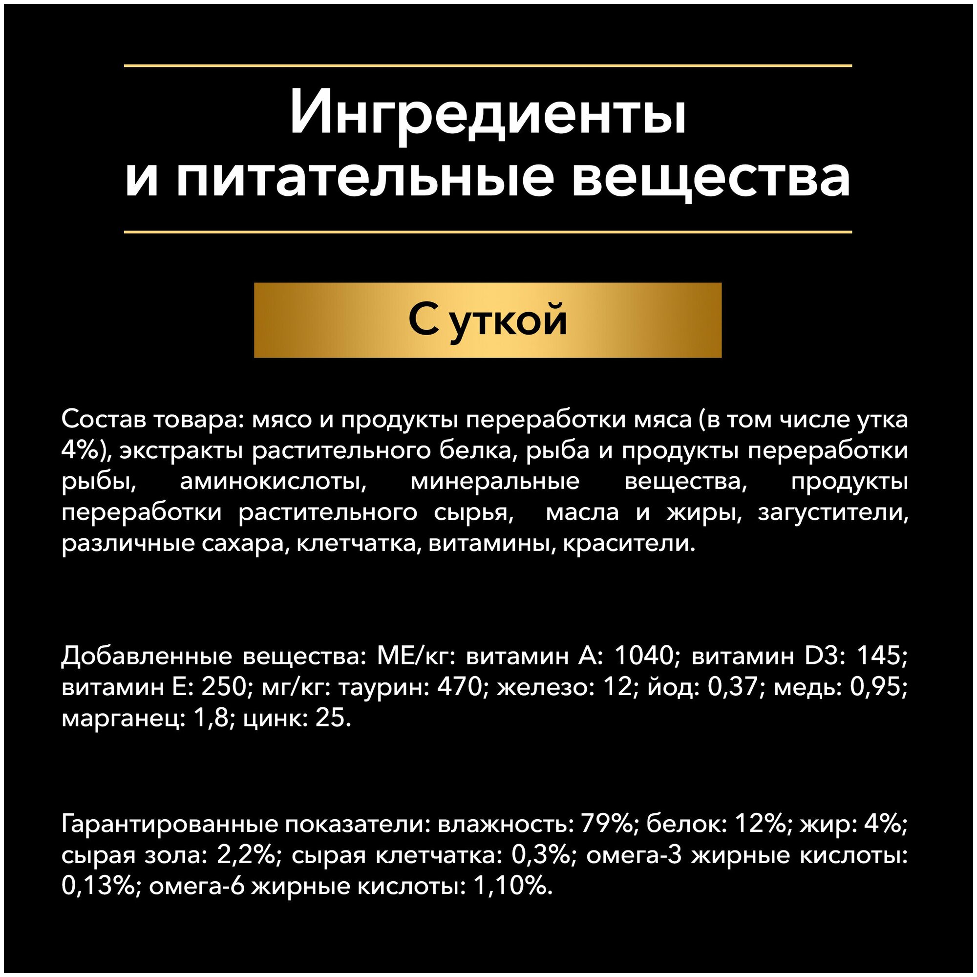 | Состав | мясо и продукты переработки мяса (в том числе индейка 4%), экстракты растительных белков, рыба и продукты переработки рыбы, продукты переработки растительного сырья, минеральные вещества, растительные и животные жиры, красители, сахара, витамины |