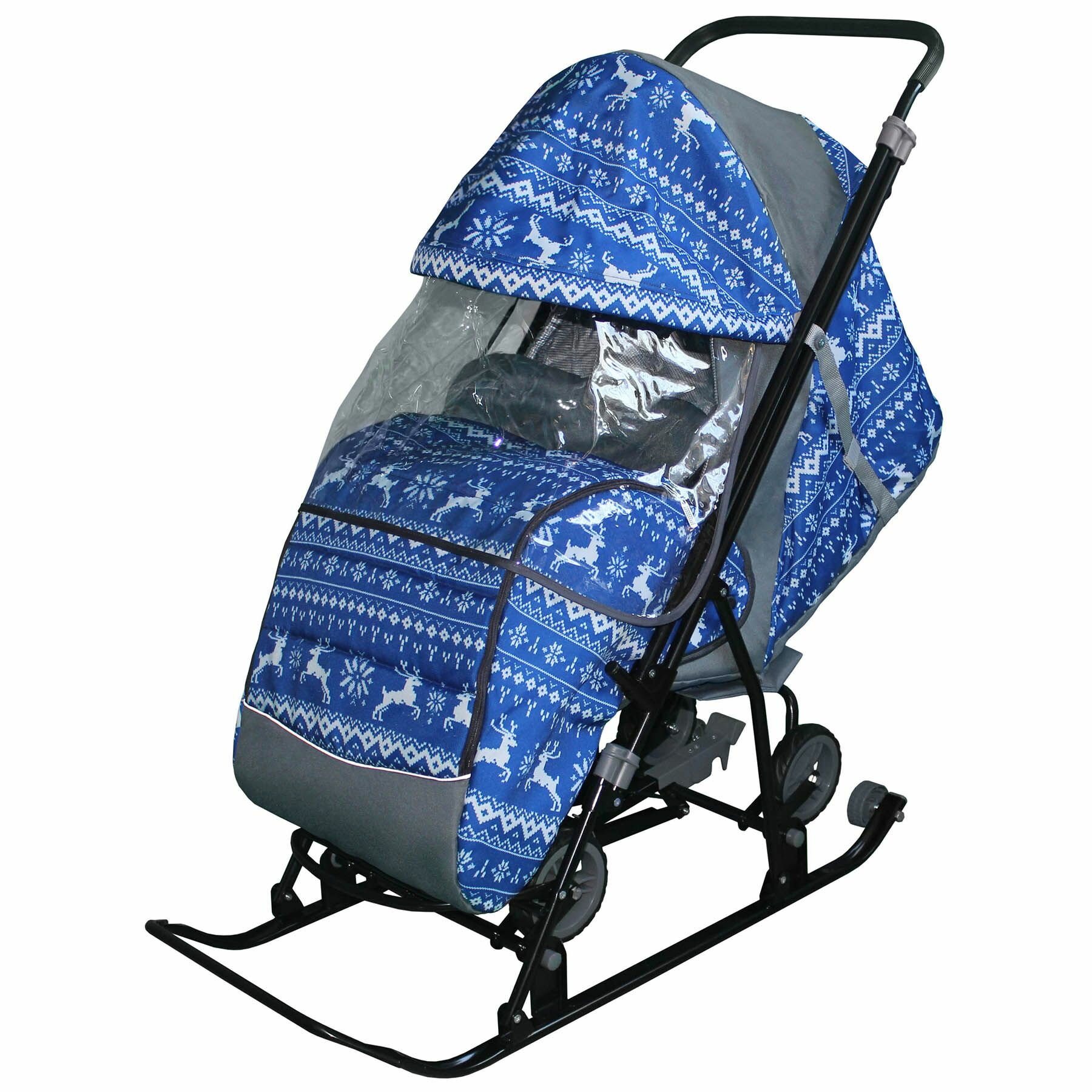 Санки коляска детские зимние Galaxy Снежинка Универсал 1 с колесами и перекидной ручкой, олени на синем интересное: