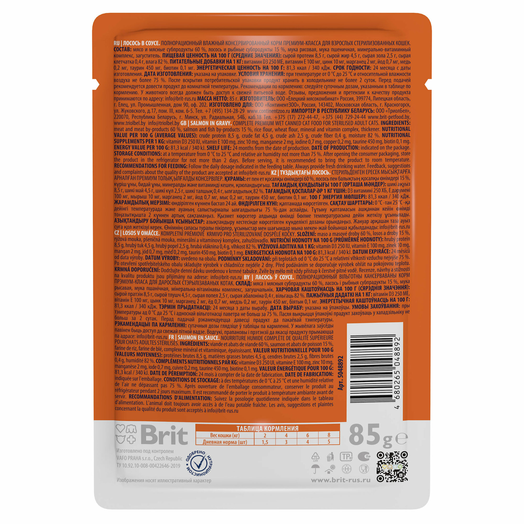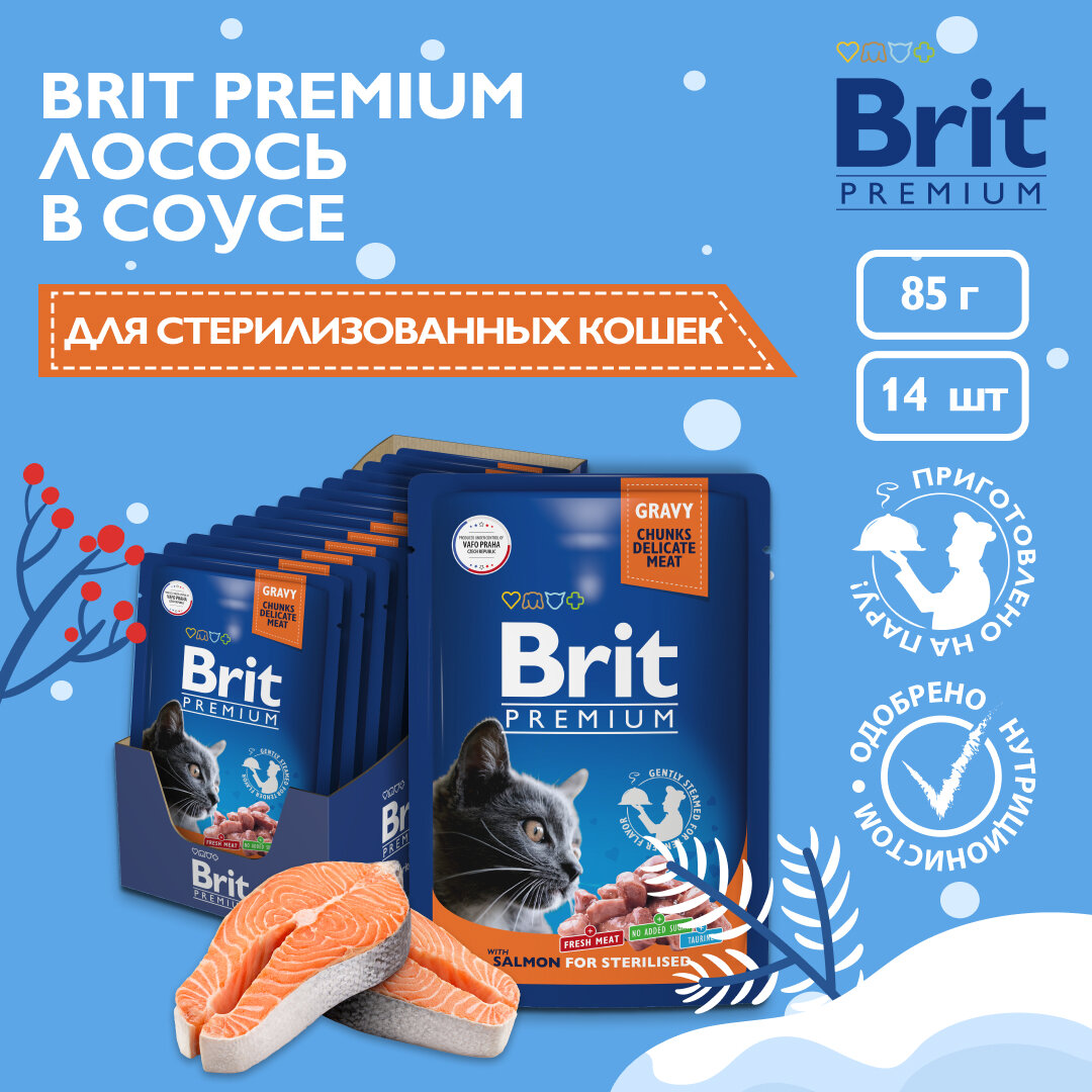 Брит Премиум 85г лосось в соусе пауч для стерилиз.кошек 14шт/1уп