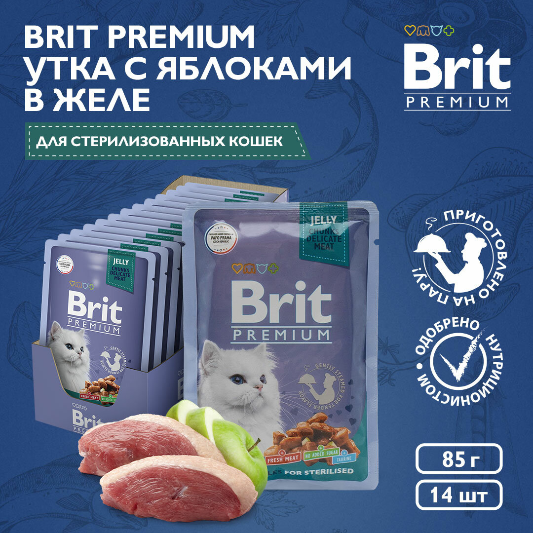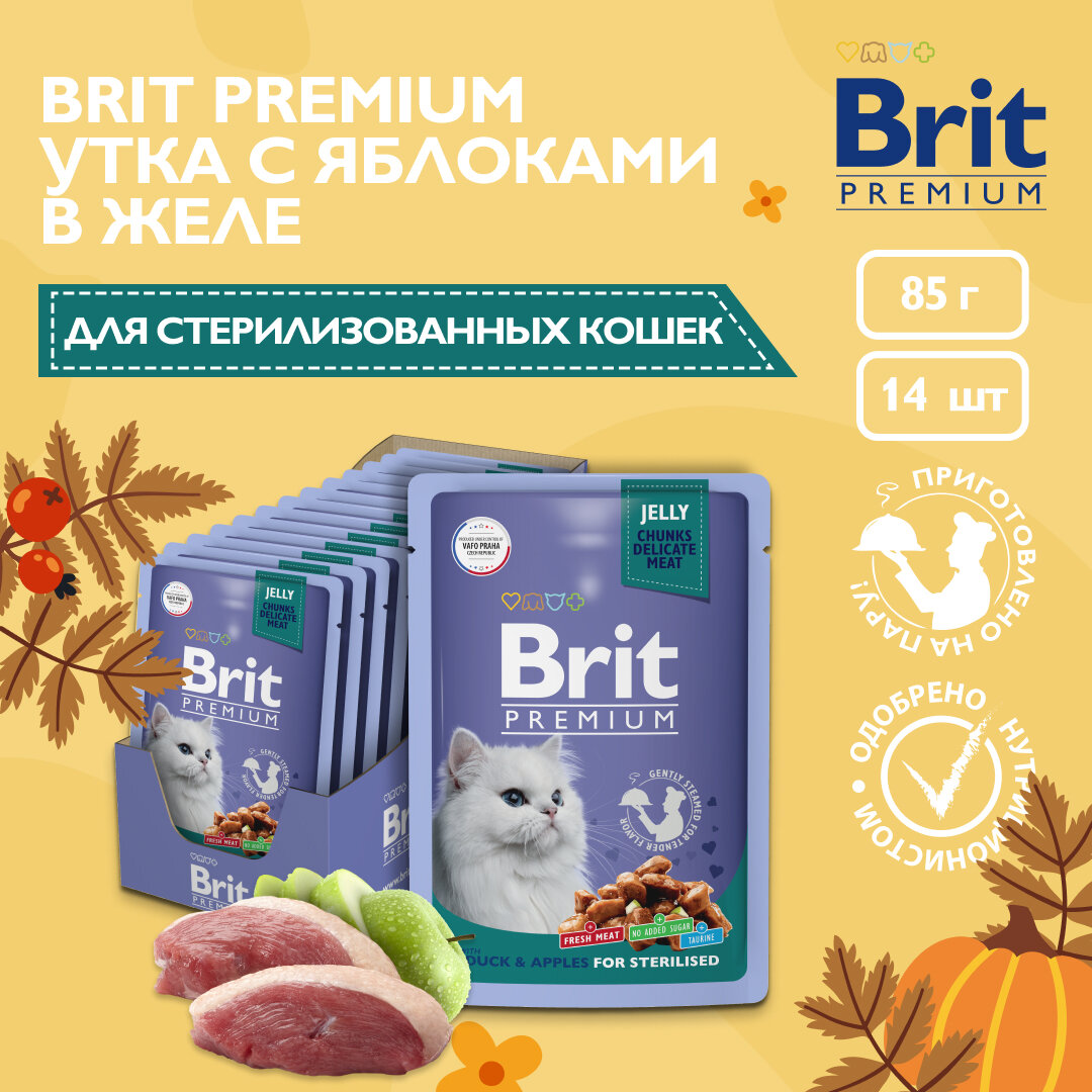 Влажный корм для стерилизованных кошек Brit Premium, утка с яблоками 14 шт. х 85 г (кусочки в желе)