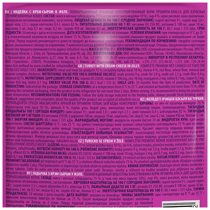 Купить BRIT PREMIUM для взр кастр котов и стер кошек с индейкой и сыром в желе пауч 85 гр 85 гр х 4 шт