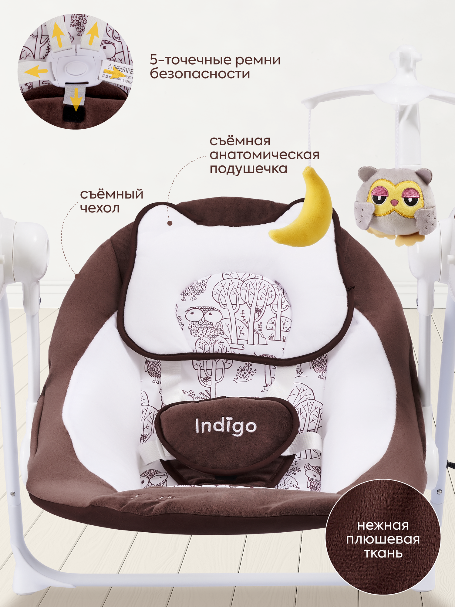 Электрокачели Indigo STAR с мобилем и пультом, коричневый