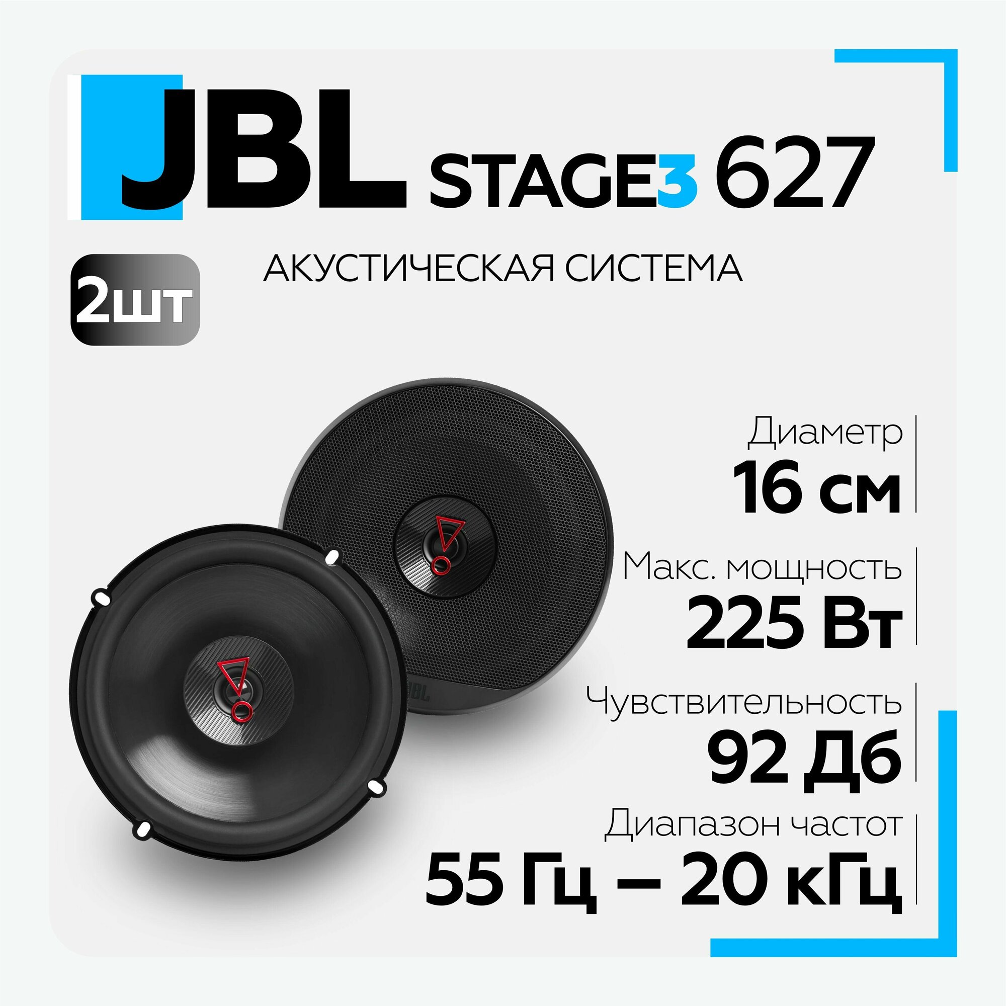 Колонки автомобильные JBL Stage3 627, 16 см (6.5 дюйм.), комплект 2 шт.