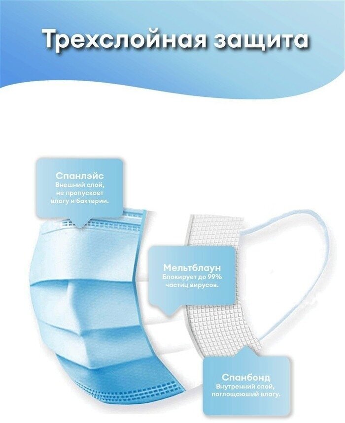 СпецМедЗащита, маски медицинские, трехслойные, голубые, 50 шт