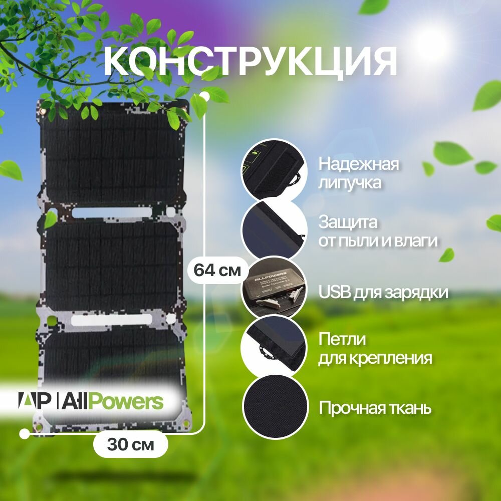Солнечная панель Allpowers 21Вт / 5В камуфляж, складное солнечное зарядное устройство интересное: