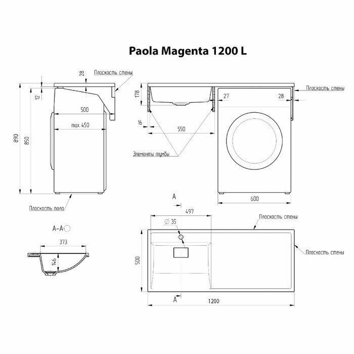 Раковина над стиральной машиной Paola Magenta 120х50 левая (4660105230694)