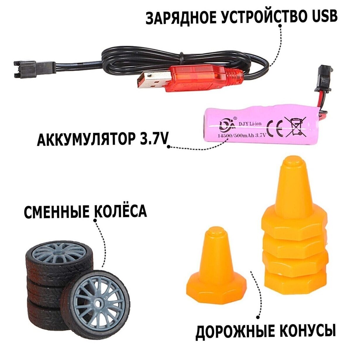 | Комплектация | машинка, пульт управления, аккумулятор, зарядное устройство, 6 конусов, 4 запасных колеса, инструкция |
