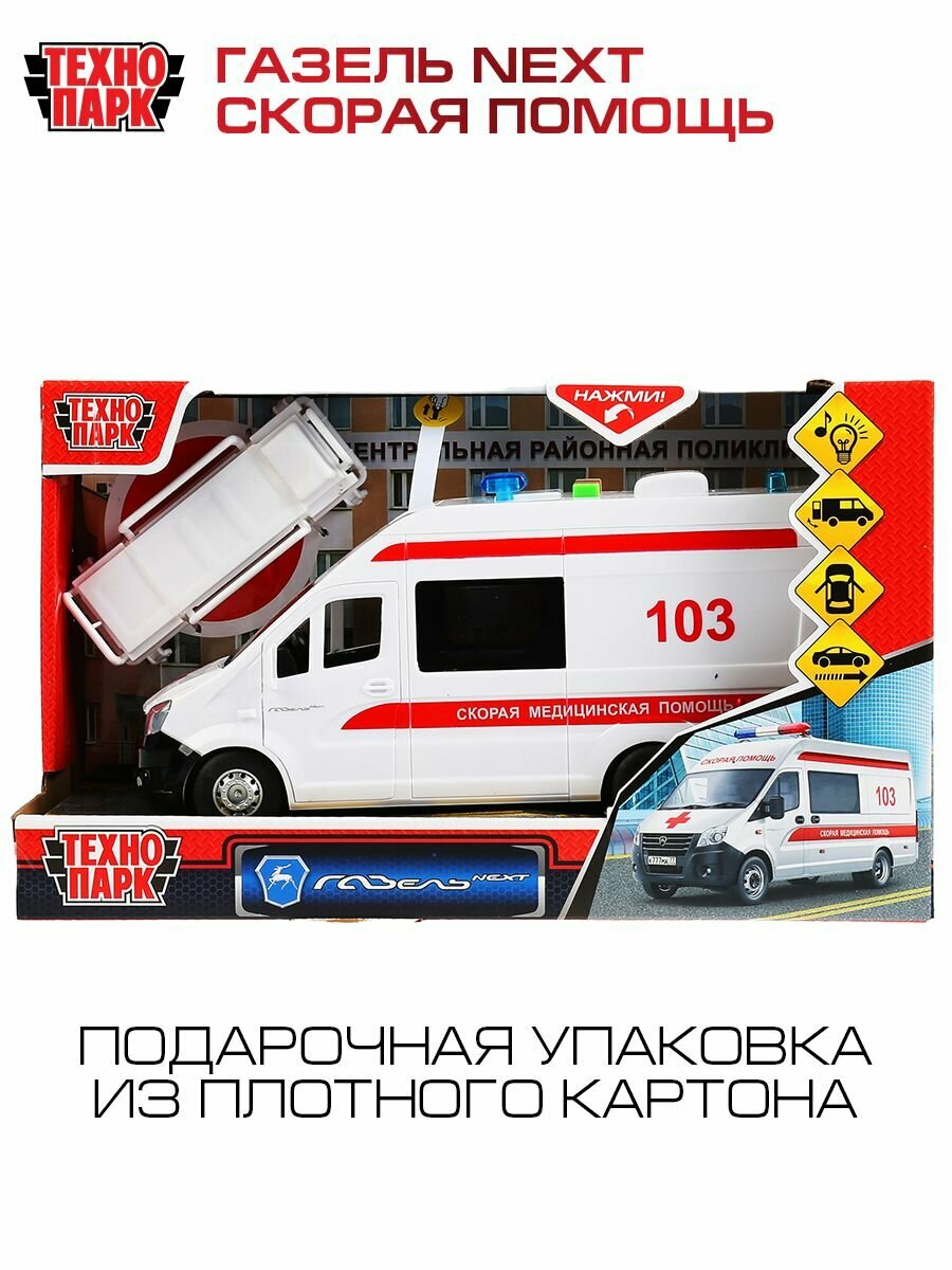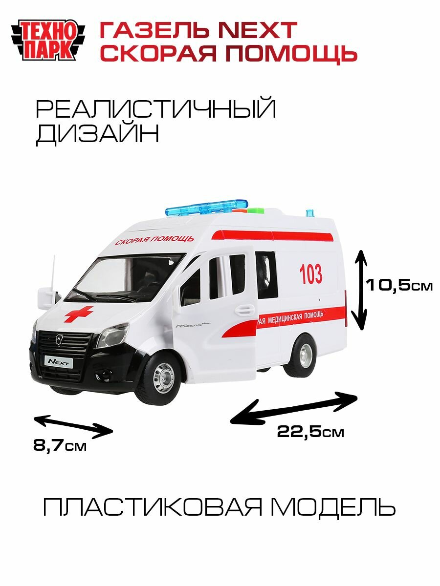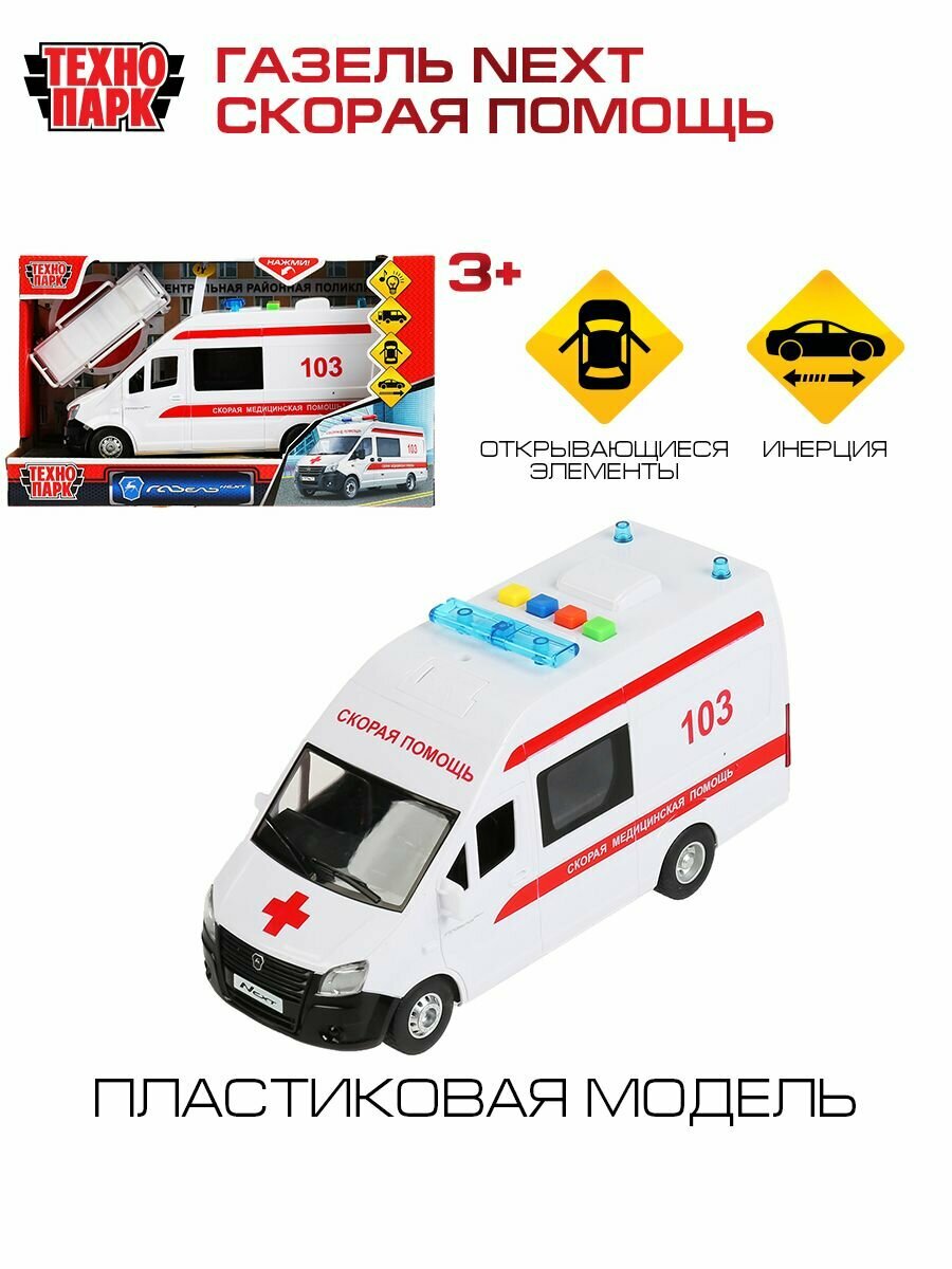 Машинка инерционная Технопарк Газель Next Скорая помощь , пластик, открываются двери, свет, звук 22,5см