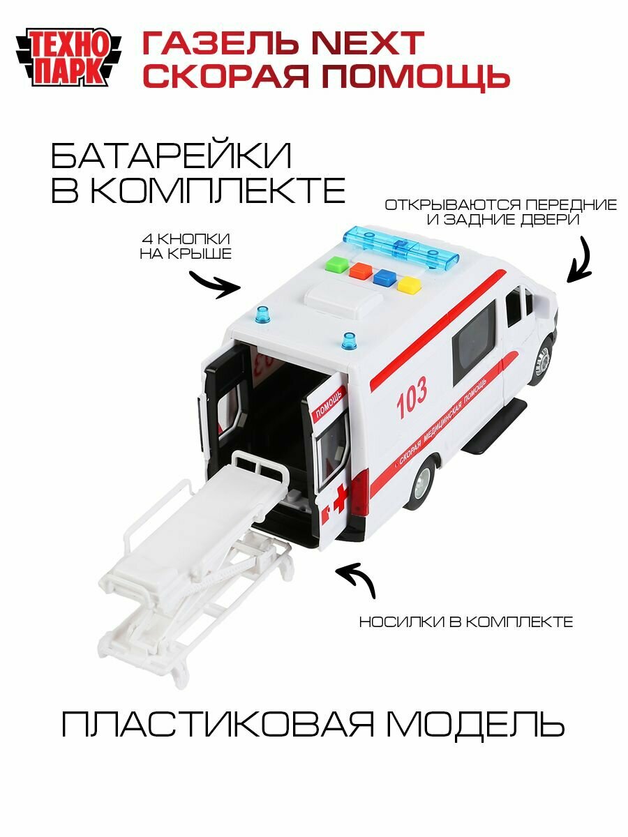 Машинка Технопарк Газель Некст Скорая помощь с носилками, 22,5 см, откр. двери, свет, звук