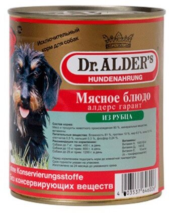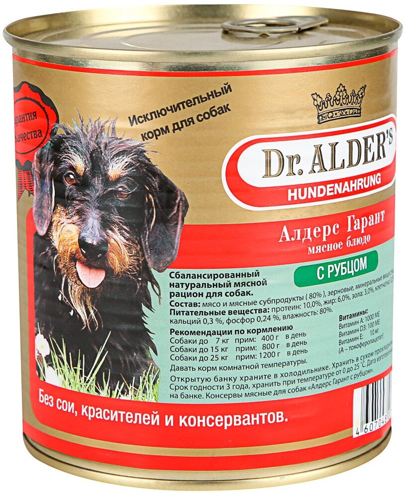 Корм для собак DR. ALDER`S Алдерс Гарант 80%рубленного мяса Рубец/Сердце конс. 750гр 1 шт