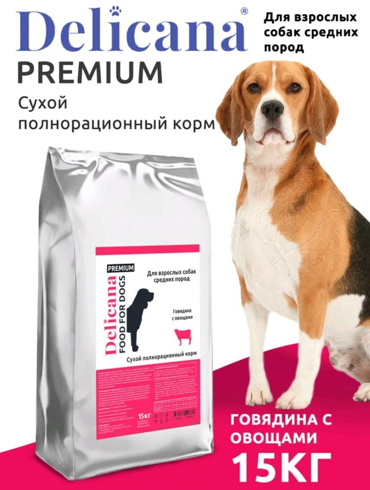 DELICANA Корм сухой для собак средних пород с говядиной, 15 кг