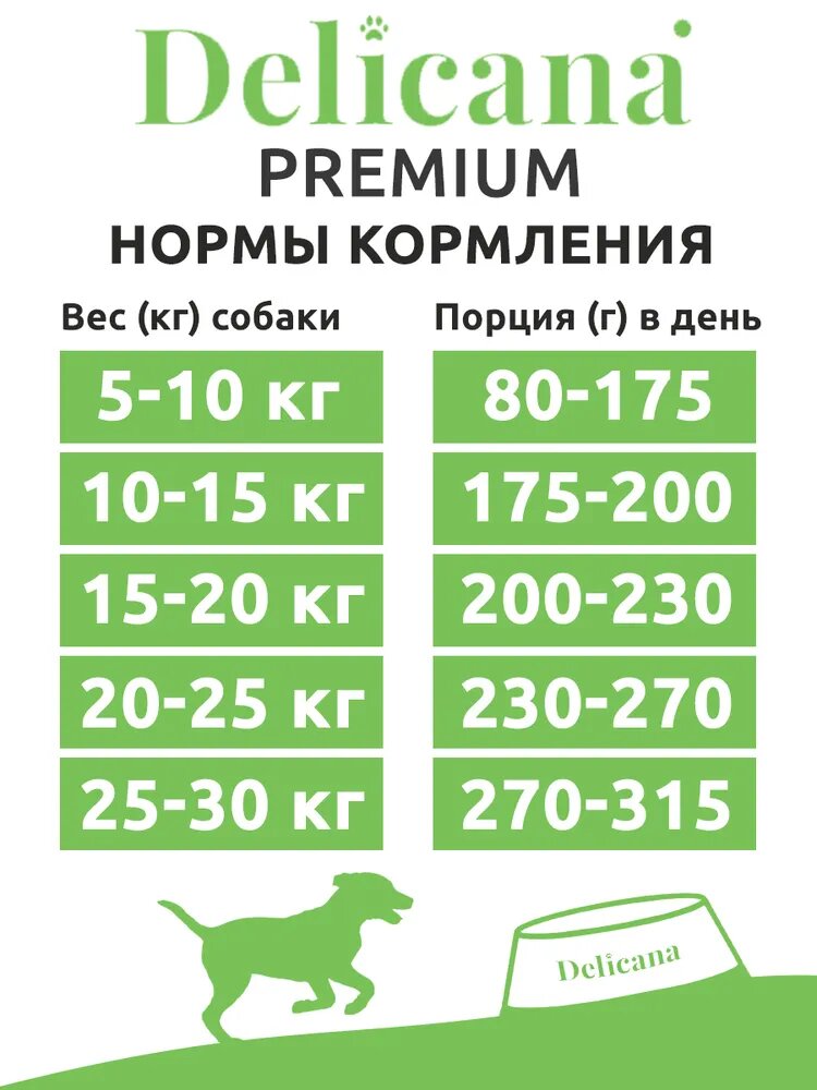 | Дозировка | - вес собаки 5-10 кг: 120-200 г/сут. - вес собаки 10-15 кг: 200-250 г/сут. - вес собаки 15-20 кг: 250-300 г/сут. - вес собаки 20-25 кг: 300-340 г/сут. - вес собаки 25-30 кг: 340-390 г/сут. |