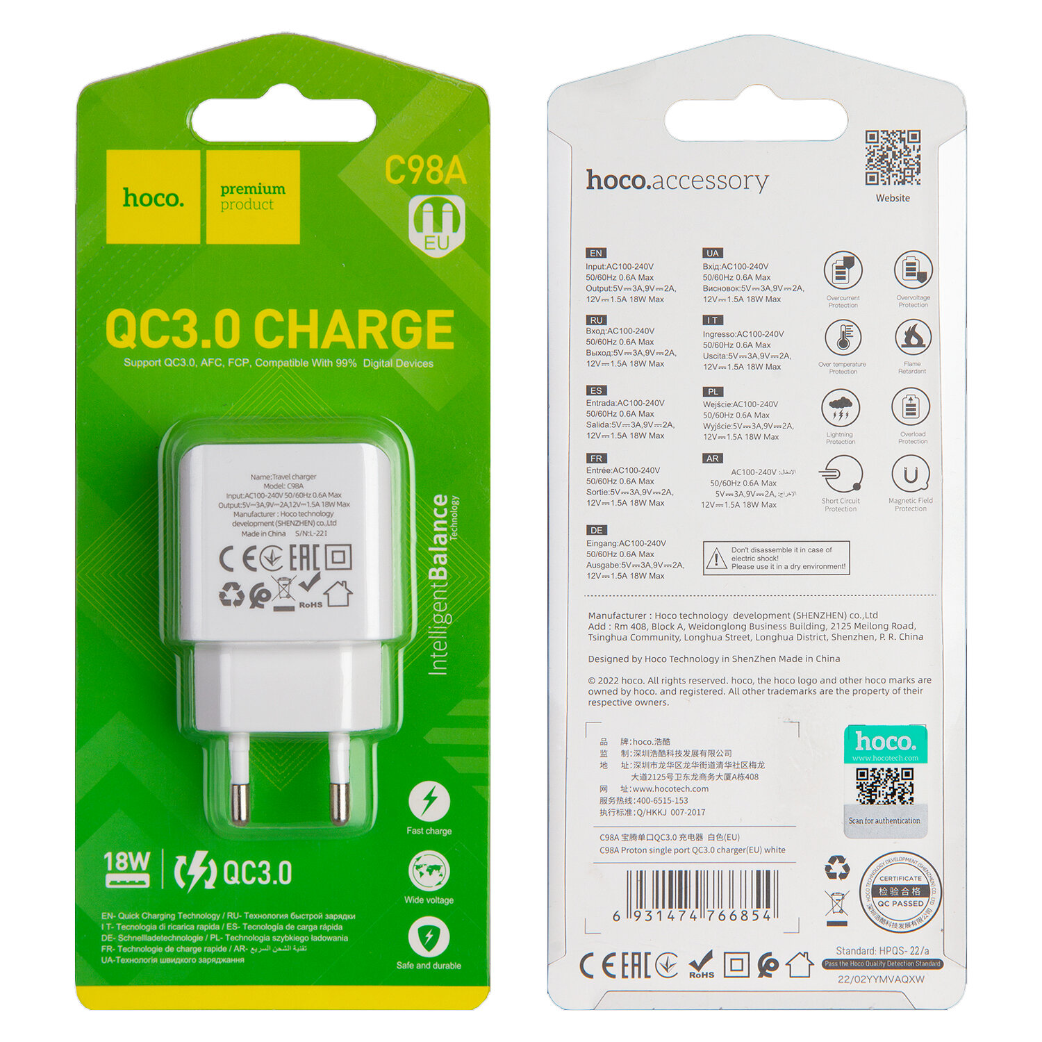 Сетевое зарядное устройство HOCO C98A Proton 1xUSB, 3.0A, 18W, белый