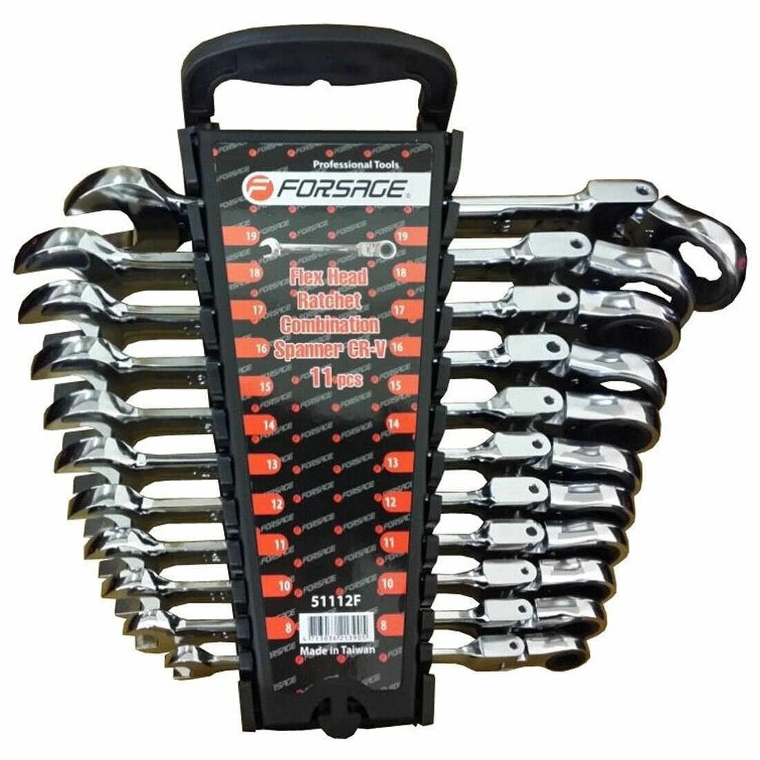 Набор ключей комбинированных трещоточных с шарниром, 11 пр: 8, 10, 11, 12, 13, 14, 15, 16, 17, 18, 19 мм, в пластиковом держателе FORSAGE F-51112F