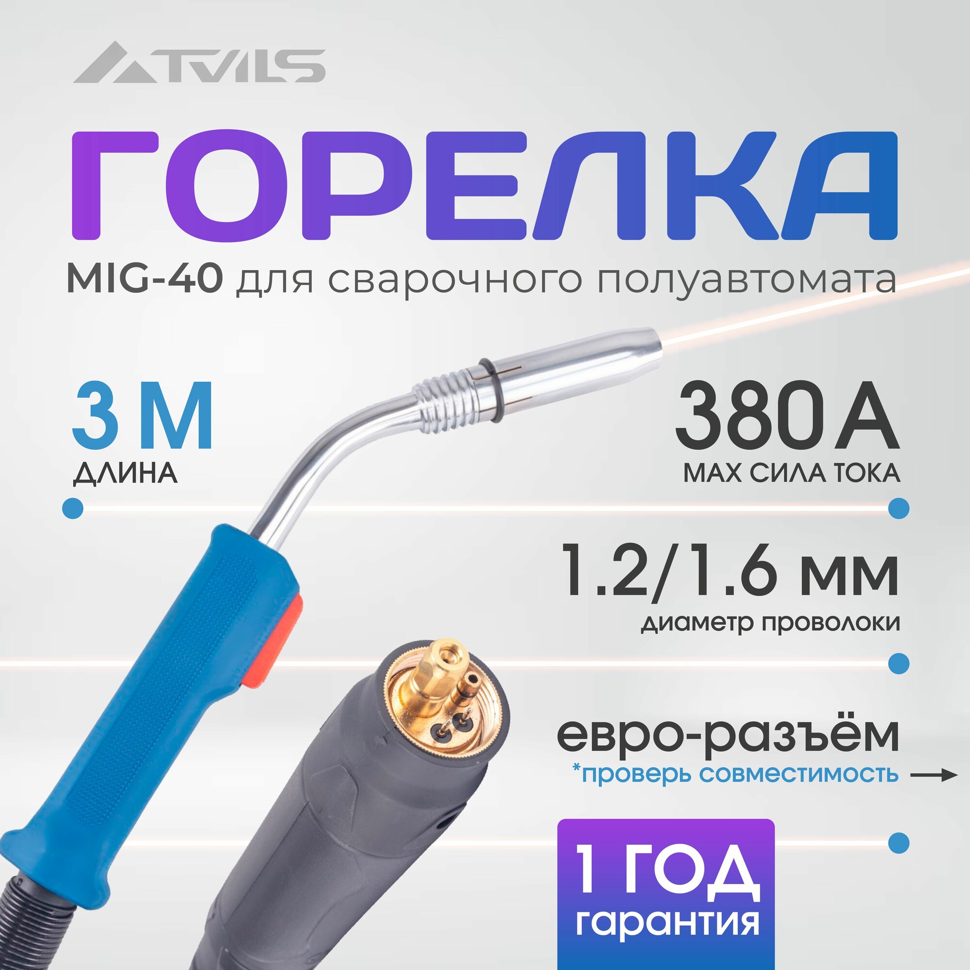 Горелка сварочная для полуавтомата MIG-40- 3 Метра / шарнир, универсальный евро разъем