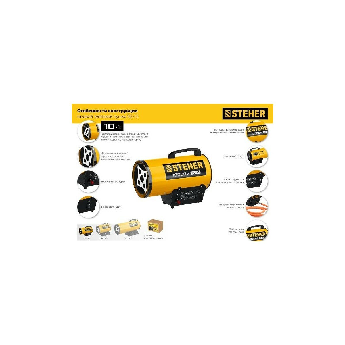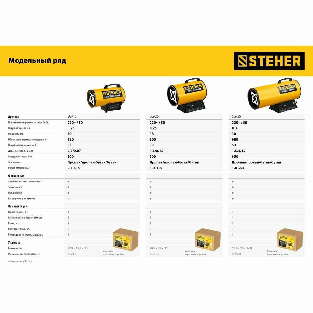 Ниже Вы можете прочитать отзывы на Пушка газовая тепловая STEHER SG-15, ознакомится с подробными характеристиками, посмотреть интересные обзоры и фотографии на Пушка газовая тепловая STEHER SG-15.