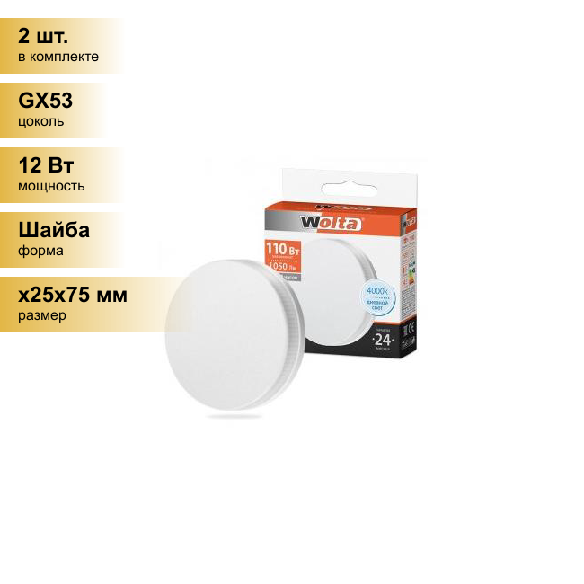 Купить (2 шт.) Светодиодная лампочка Wolta лампа св/д GX53 12W (1050lm) 4000К 4K матов 24x75 25S75R12GX53 . Цоколь GX53
