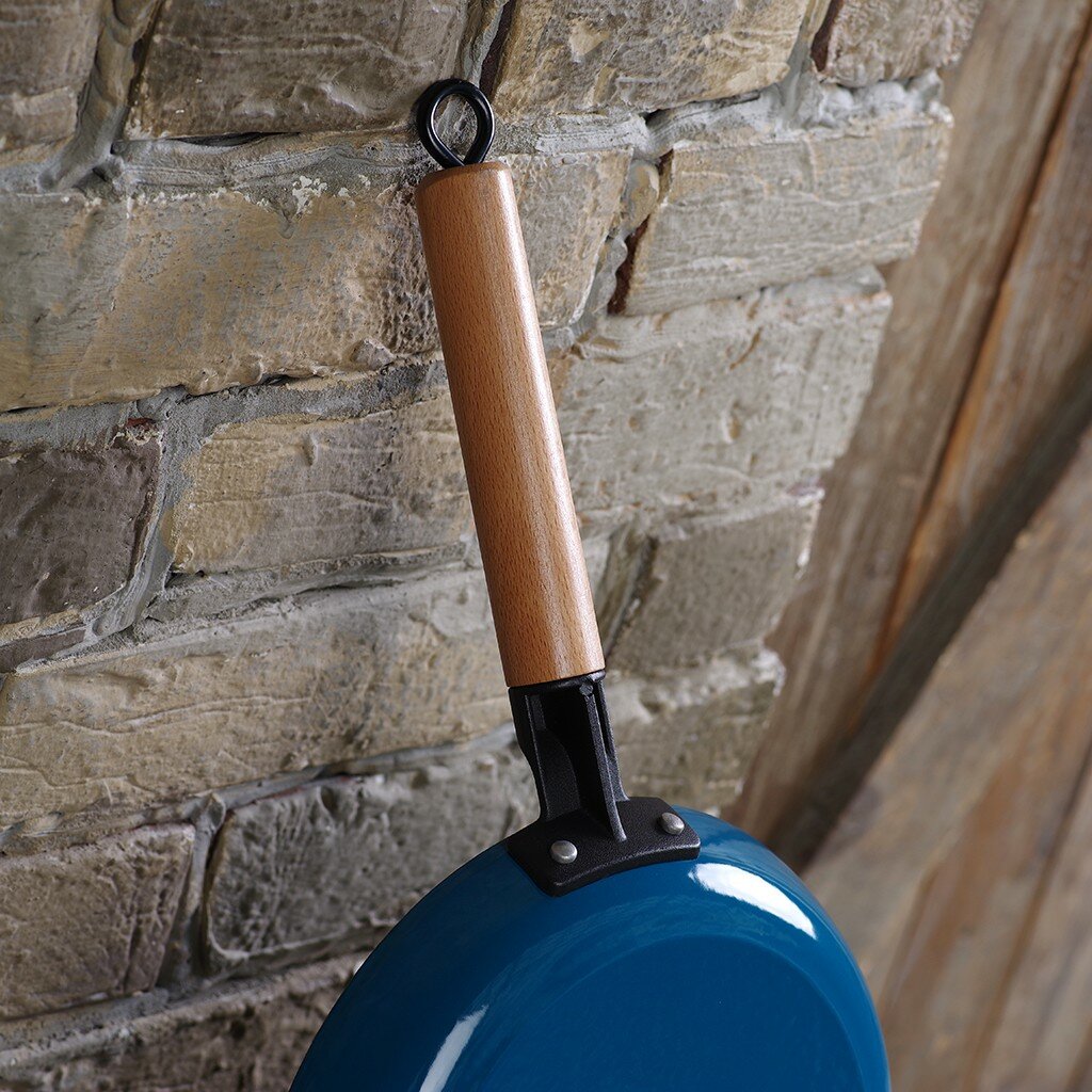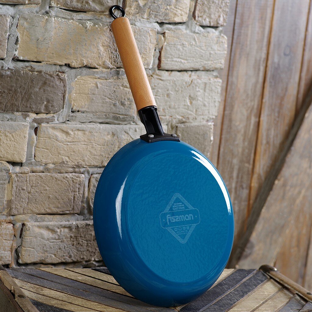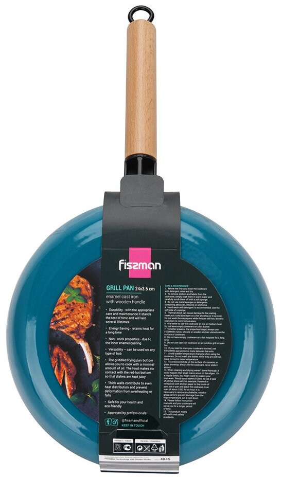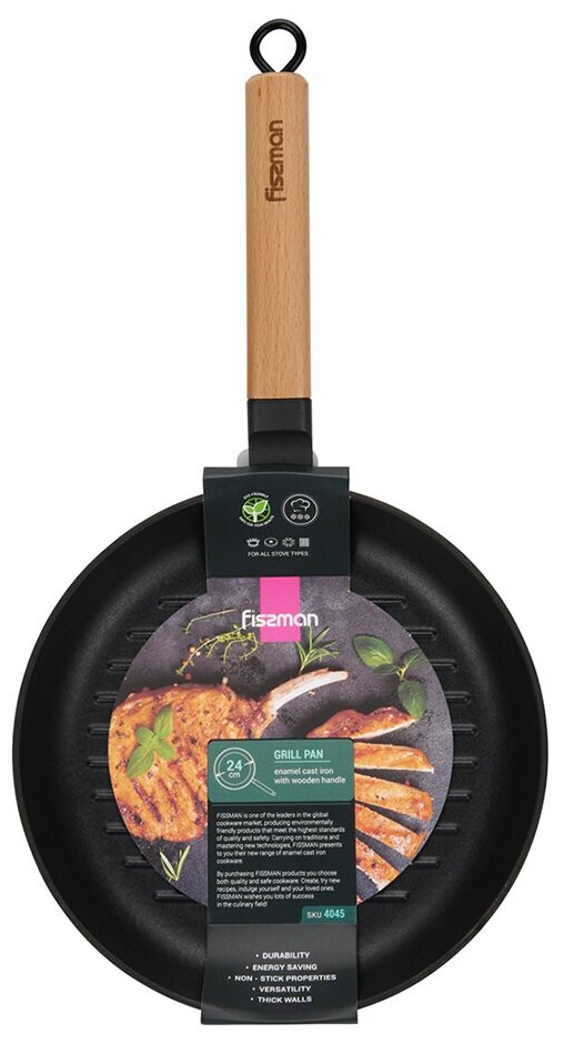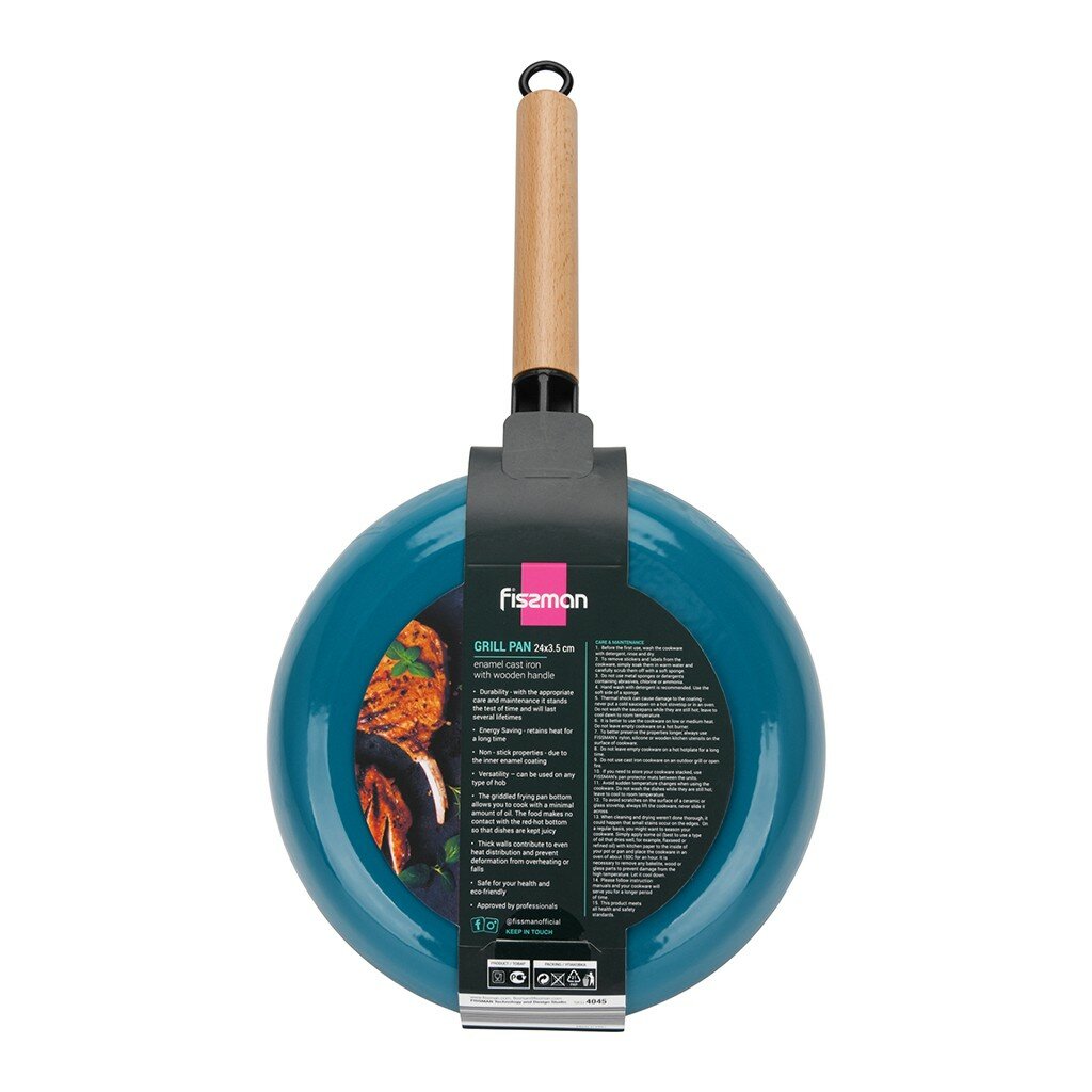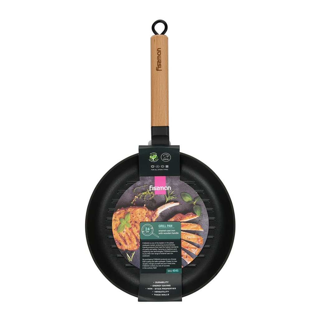 Сковорода-гриль Fissman 24x3,5 см с деревянной ручкой, эмалированный чугун, индукция (4045)