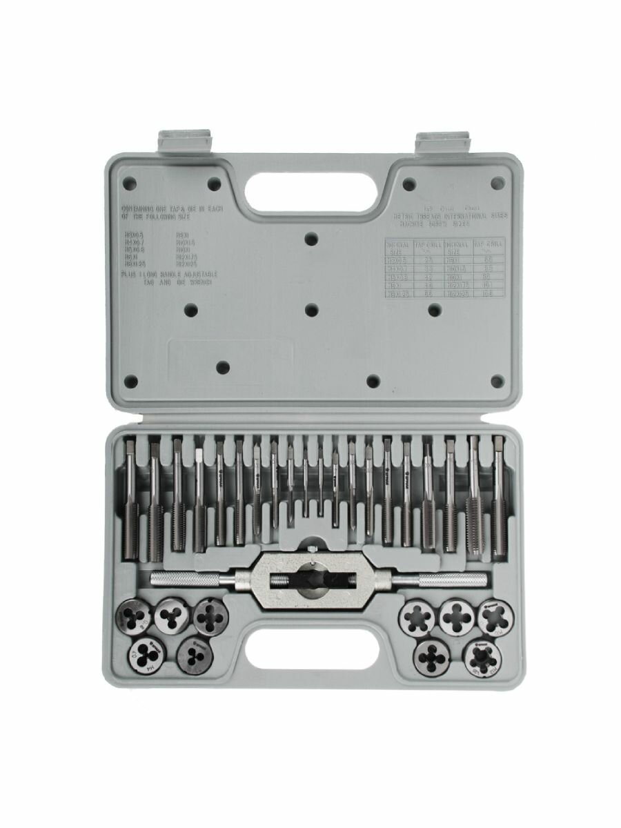 | Подробная комплектация | - 10 метчиков комплектных из 2 штук и 10 плашек: M3x0.5, M4x0.7, M5x0.8, M6x1.0, M8x1.0, M8x1.25, M10x1.0, M10x1.5, M12x1.25, M12x1.75; - плашко-метчикодержатель; - пластиковый кейс. |