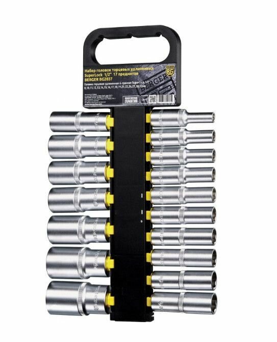 Купить Набор головок торцевых удлиненных BERGER BG2037 1/2" SuperLock 17 предметов (8-32мм) подвес