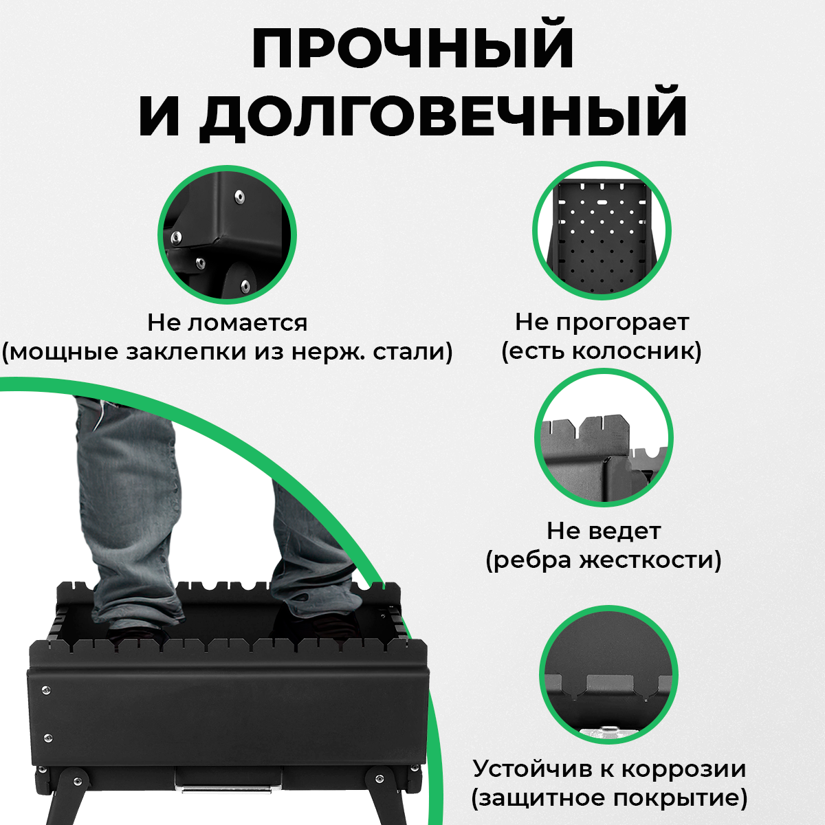 | Дополнительная информация | габариты в сложенном виде (ДxШxВ): 46×32,5×9,5 см; размеры жаровни 44 × 30 × 16 см; заклепки: ø5/9 мм сталь а2 (нерж); особенности: 2 положения рабочей высоты мангала, система вентиляции жаровни, регулировка жара с помощью заслонок, количество одновременно размещаемых шампуров: до 6 в продольном положении и до 8 - в поперечном, возможность установки решетки гриль; регулируемая высота: 44 и 72,5 см |