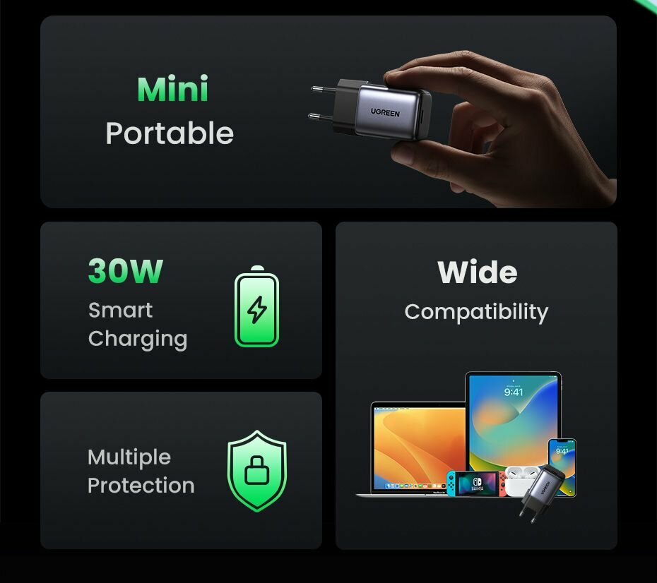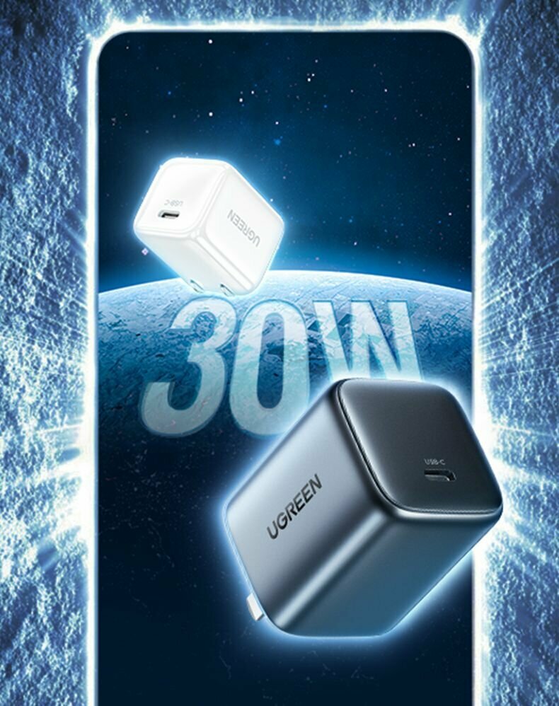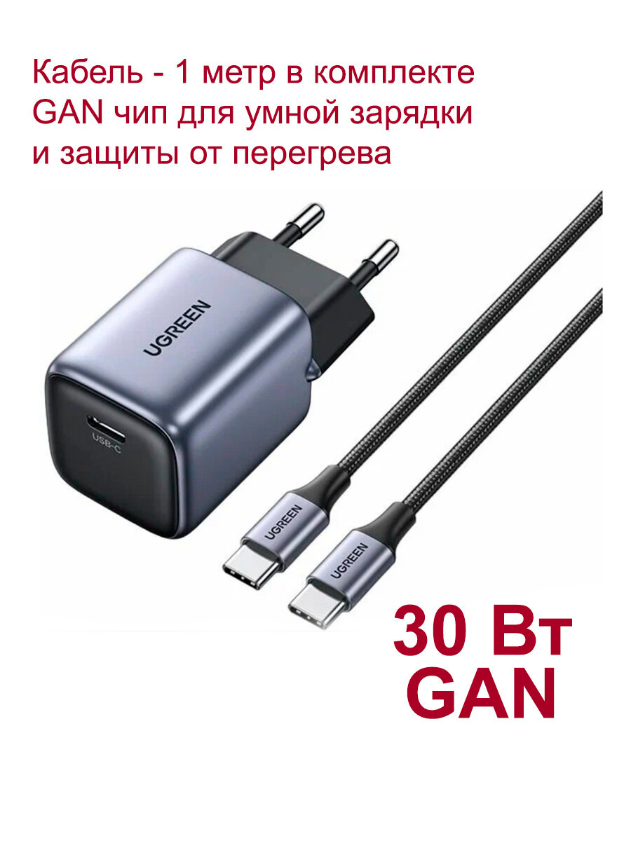 СохранитьСетевое зарядное устройство UGREEN CD319 (25257) Nexode Mini 30W USB-C PD GaN с кабелем 1м 60W. Цвет: серый космос интересное: