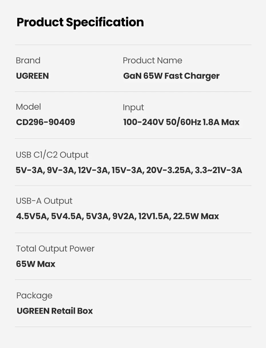 Зарядное устройство UGREEN CD137 Fast Charging Power Adapter With PD 20W EU