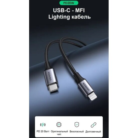 Кабель UGREEN US304 (60759) USB-C to Lightning M/M Cable Aluminum Shell Braided. Длина 1 м. Цвет: черный