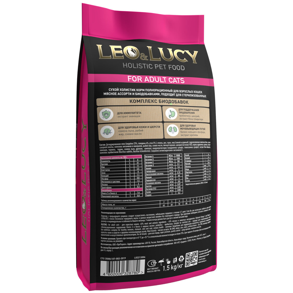 Купить LEO&LUCY сухой холистик корм полнорационный для взрослых кошек мясное ассорти и биодобавками, подходит для стерилизованных, 1,5 кг