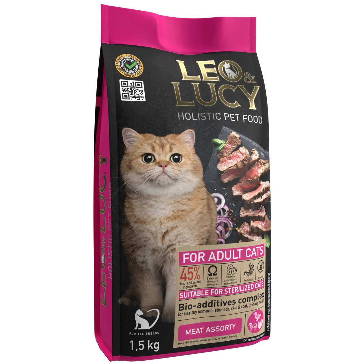 Сухой холистик корм Leo&Lucy полнорационный для взрослых кошек мясное ассорти и биодобавками, подходит для стерилизованных, 1,5 кг