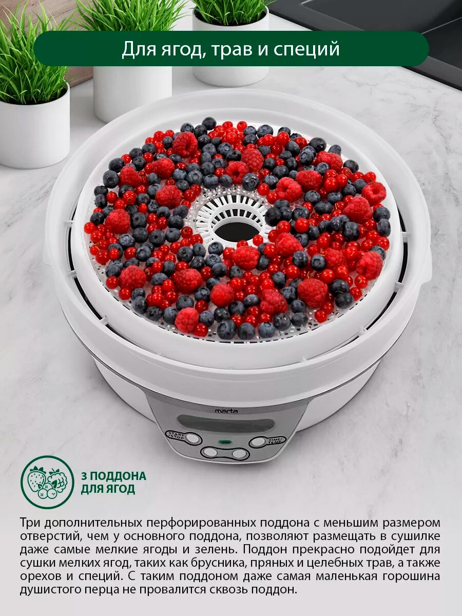 Дегидратор сушилка для овощей электросушилка MARTA MT-FD1888C 14 поддонов (8 основных + 3 для пастилы + 3 для ягод) белый