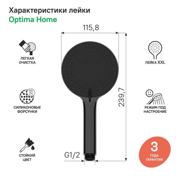 Лейка для душа IDDIS Optima Home OPH3F0Bi18 черная матовая 3 режима круглая
